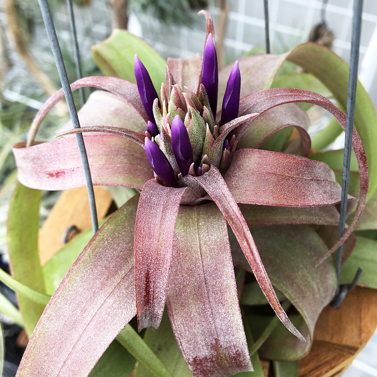 開花済み株 ンツ ハイブリッド ブラキカウロス セレクタ ストレプトフィラ チーク材バスケット(S)のセット ティランジア NO.014